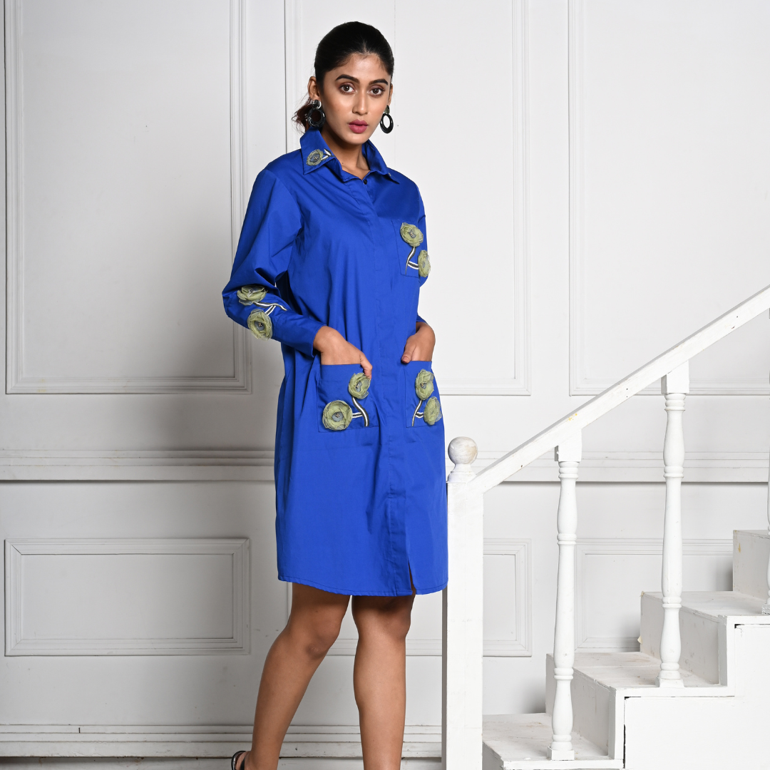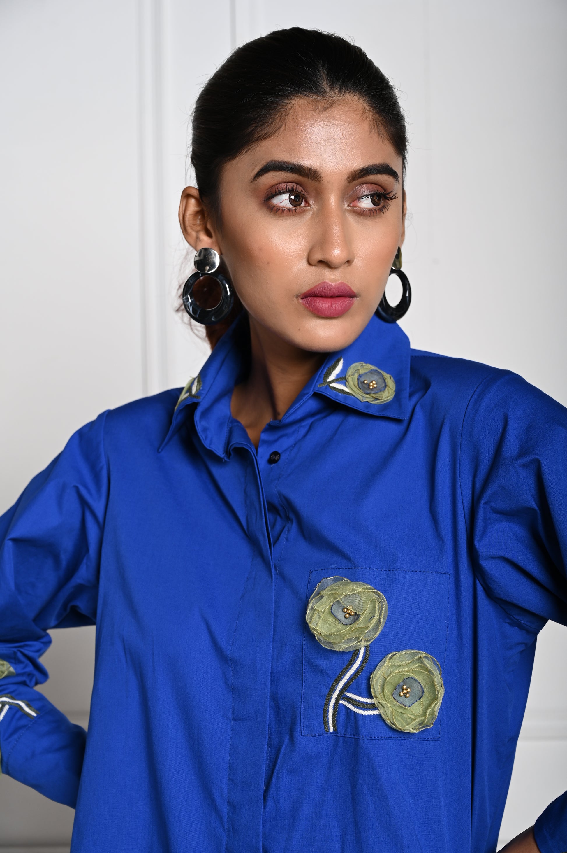 A short cobalt blue shirt dress, beautifully adorned with 3D organza flowers for a touch of elegance and charm.
