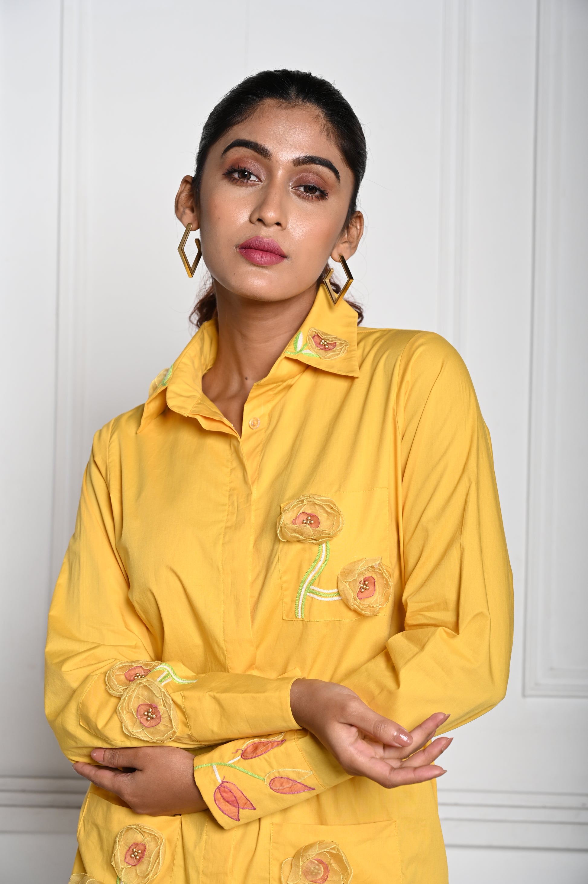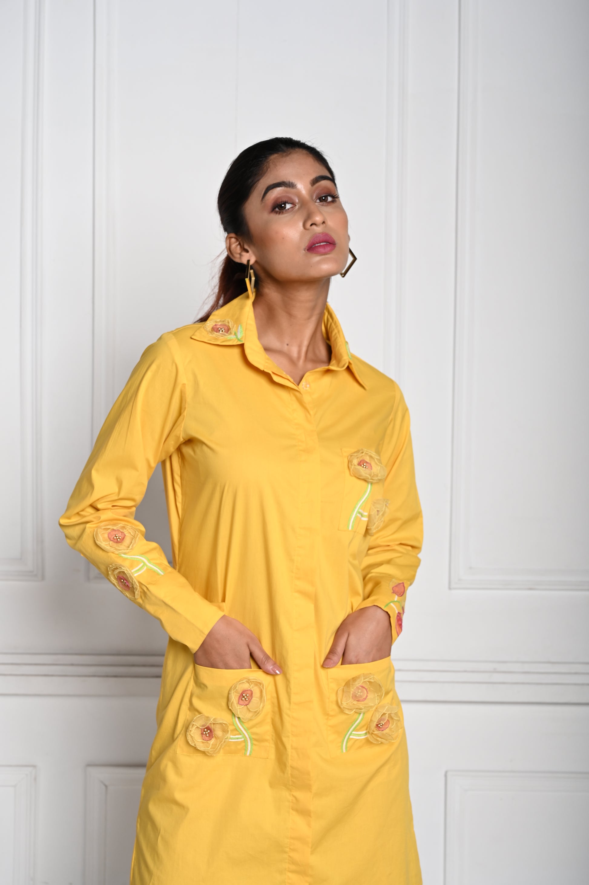 A mini yellow dress, beautifully adorned with 3D organza flowers for a touch of elegance and charm.