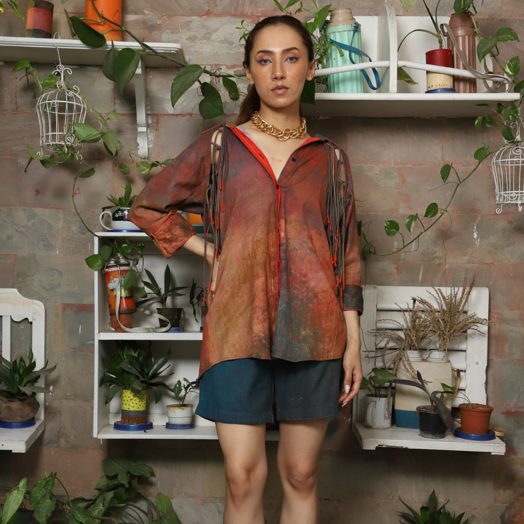A casual co-ord set in sunset print features playful string details and contrast piping on the shirt paired with breezy shorts for laid-back summer style with a touch of charm.