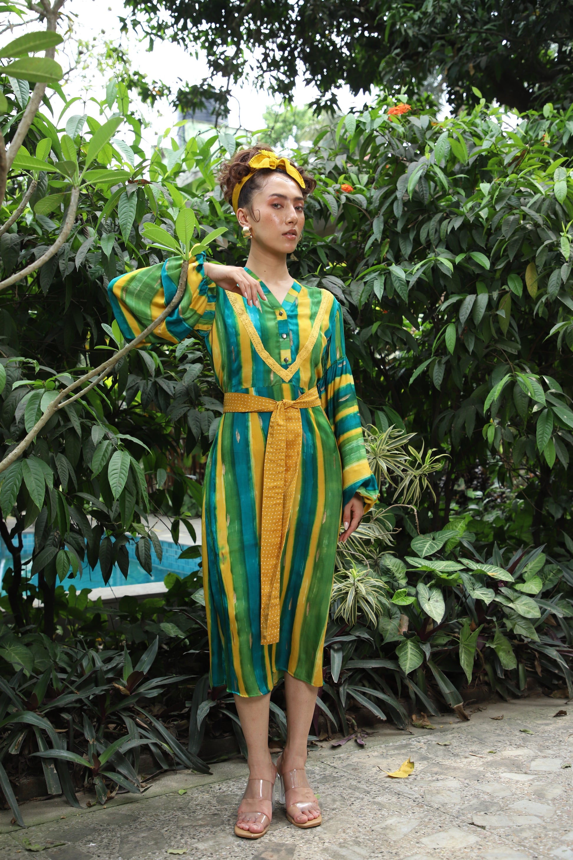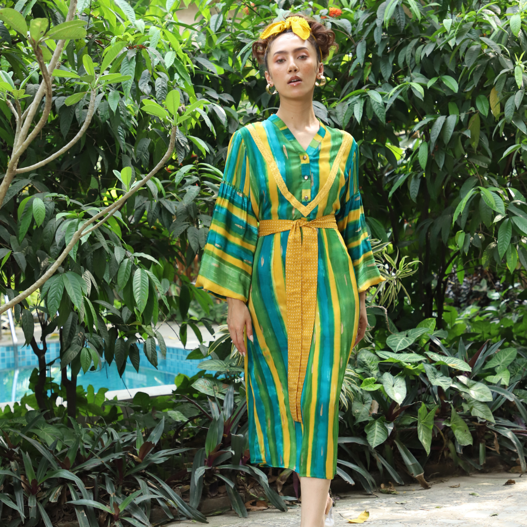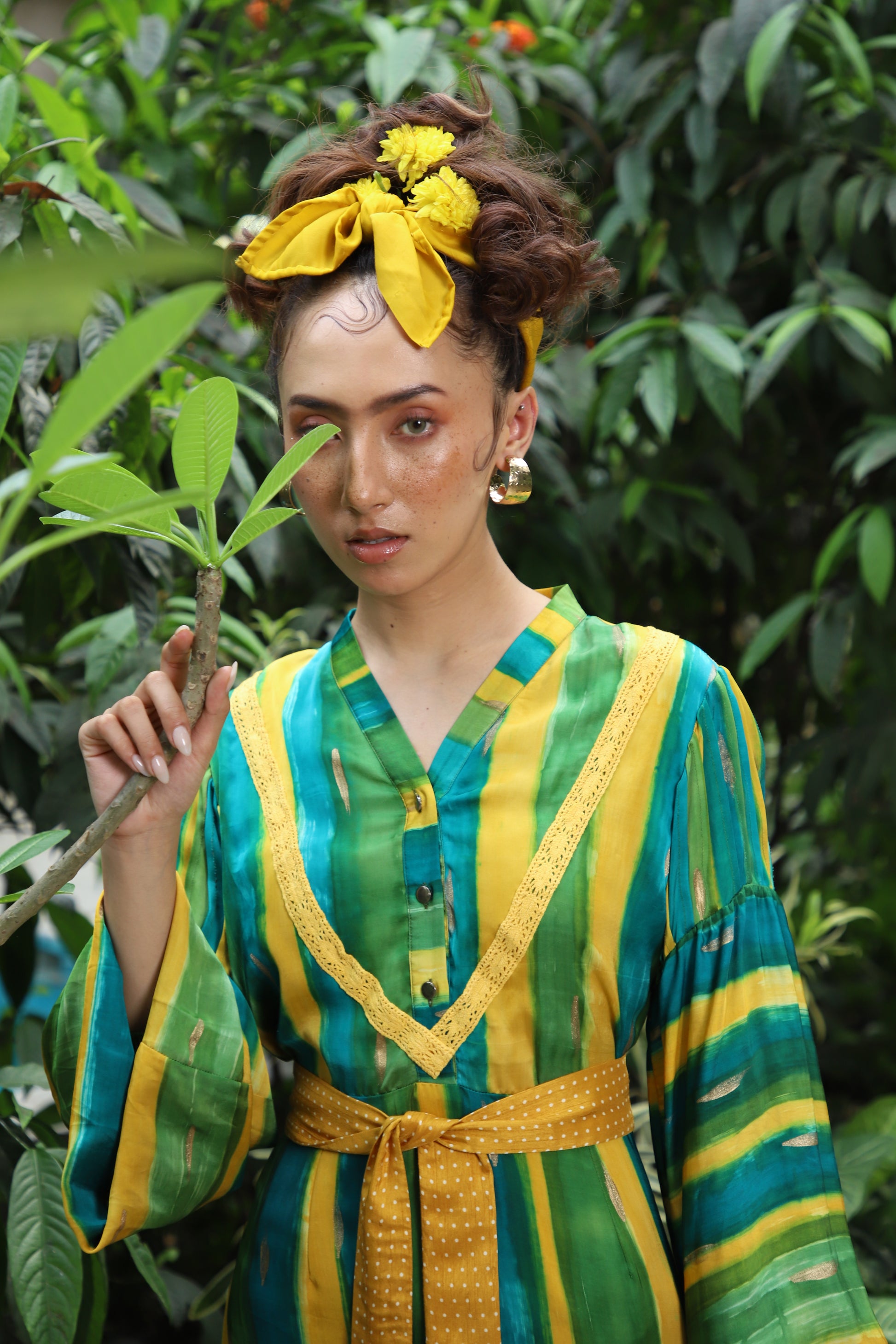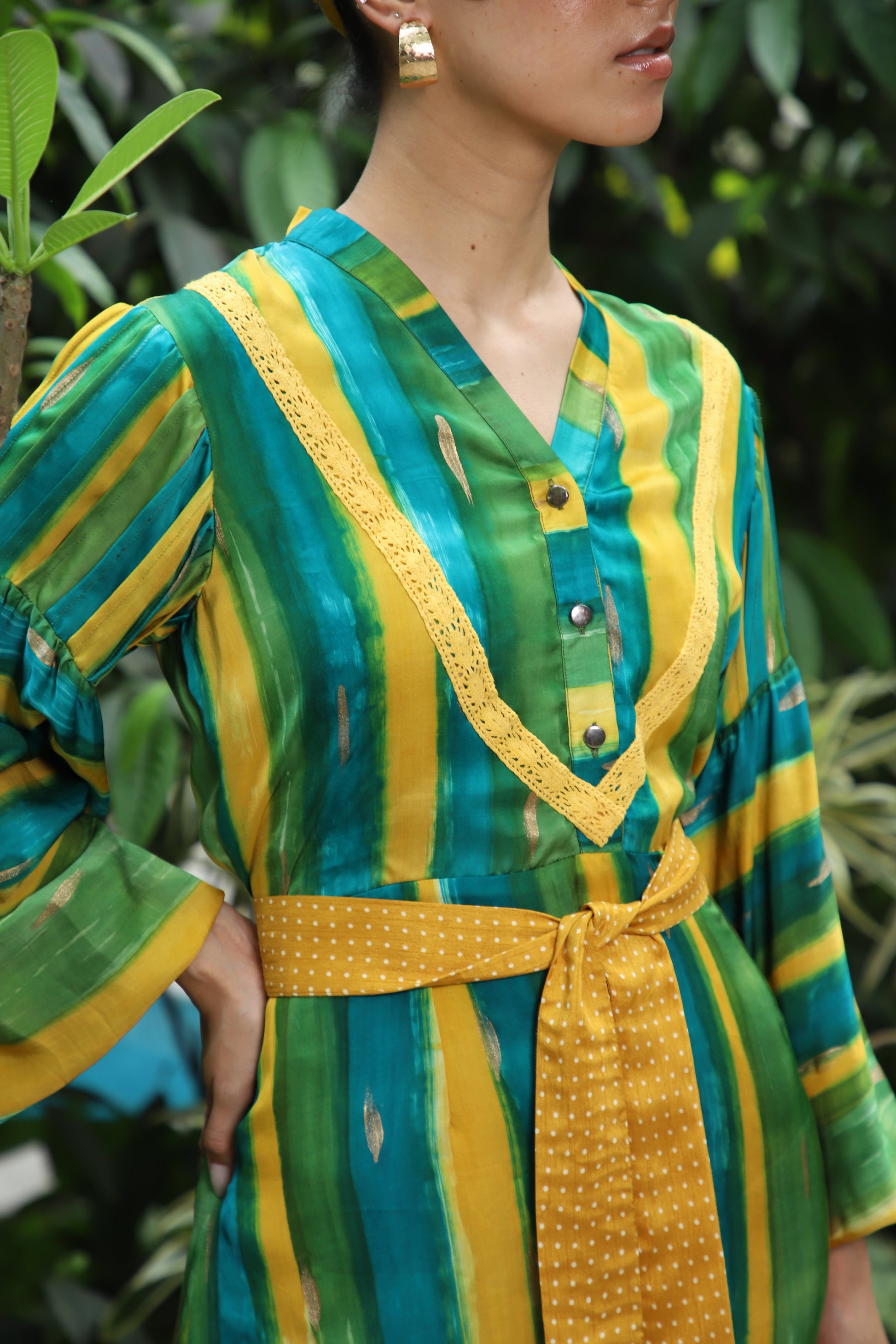 A midi dress showcasing hand-painted forest stripes, enhanced by charming contrast lace details and an attached belt for a refined silhouette.