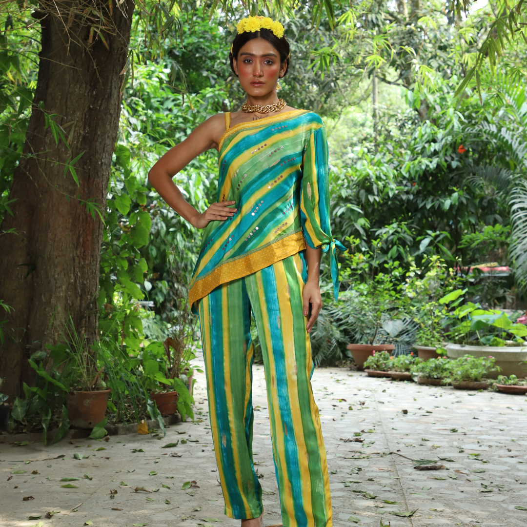 A co-ord set in hand-painted forest stripes, showcasing a chic one-shoulder top with contrast details and sequin embellishments, perfectly paired with sleek straight pants for effortless sophistication.