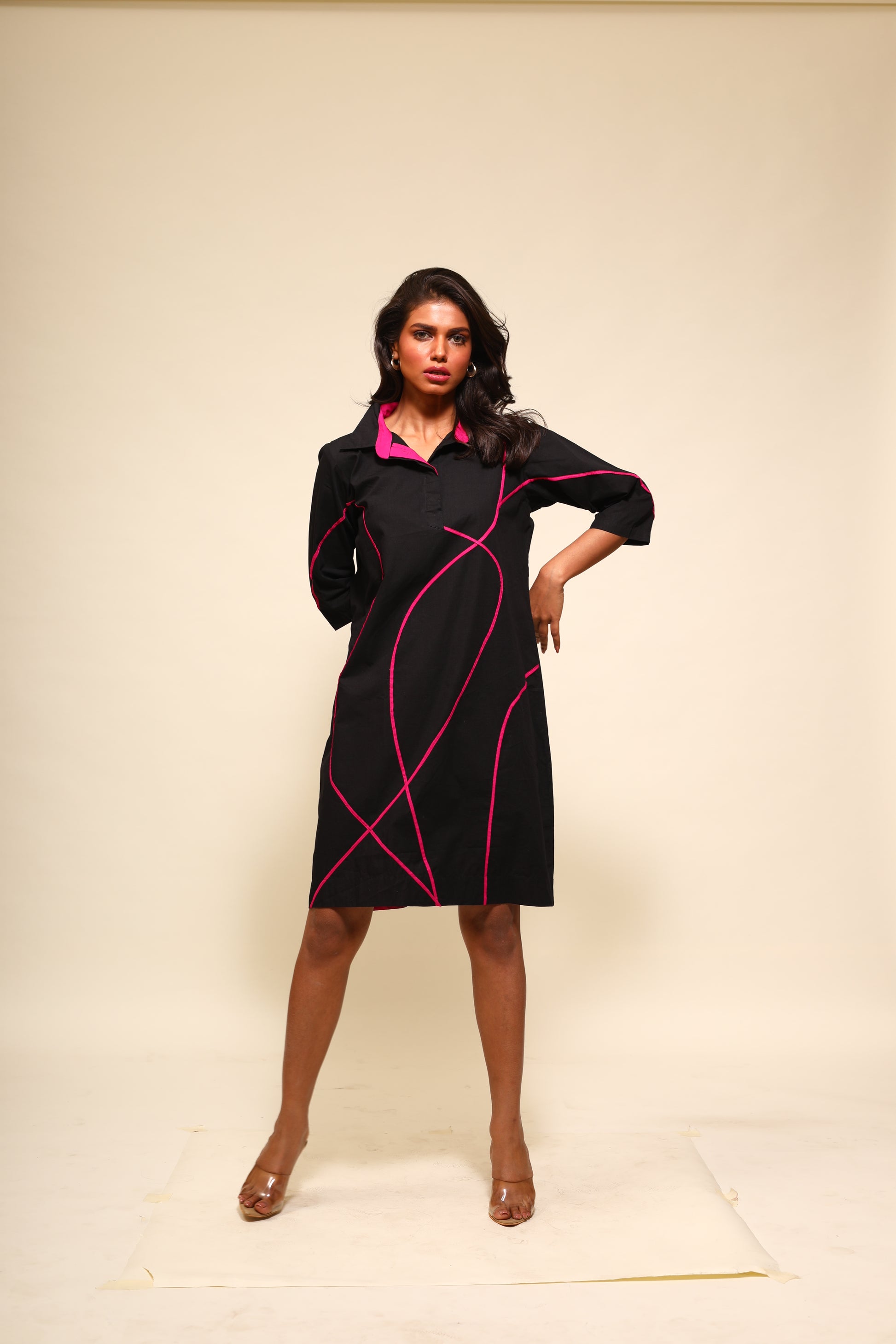 A black mini dress reimagined with bold artistry. This statement piece features striking fuchsia pink fabric details arranged across the silhouette, creating a dynamic line-art effect.