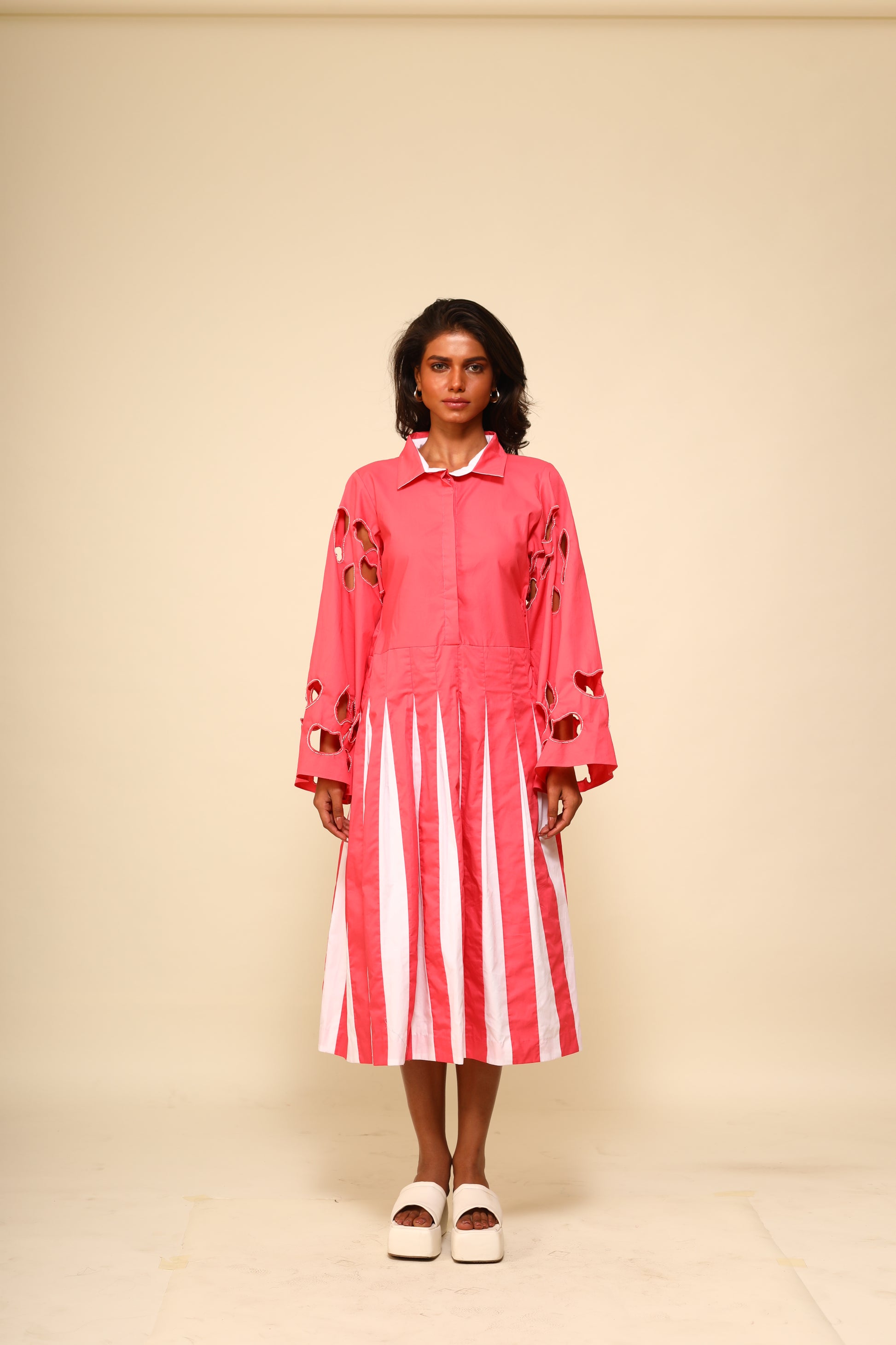 A chic pink and white dress, featuring intricate cutwork sleeves adorned with delicate beads, and striking contrast pleating that adds a touch of sophistication and elegance.