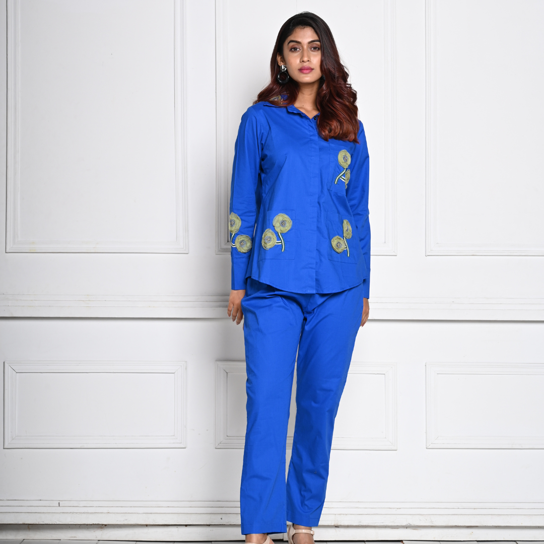 A cobalt blue poplin co-ord set featuring a chic shirt embellished with 3D organza flowers, perfectly paired with straight pants, complete with an elasticated back, side zip, and hook closure for a flawless fit.