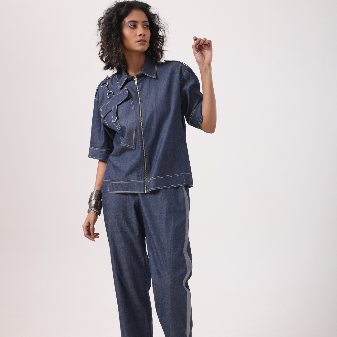 A structured co-ord set crafted in rich dark denim, this ensemble is all about utilitarian elegance. The shirt features a zip closure and is accentuated with functional pocket details and subtle anchor-inspired embroidery. Paired with coordinating pants, it’s a powerful yet effortless look for everyday edge.