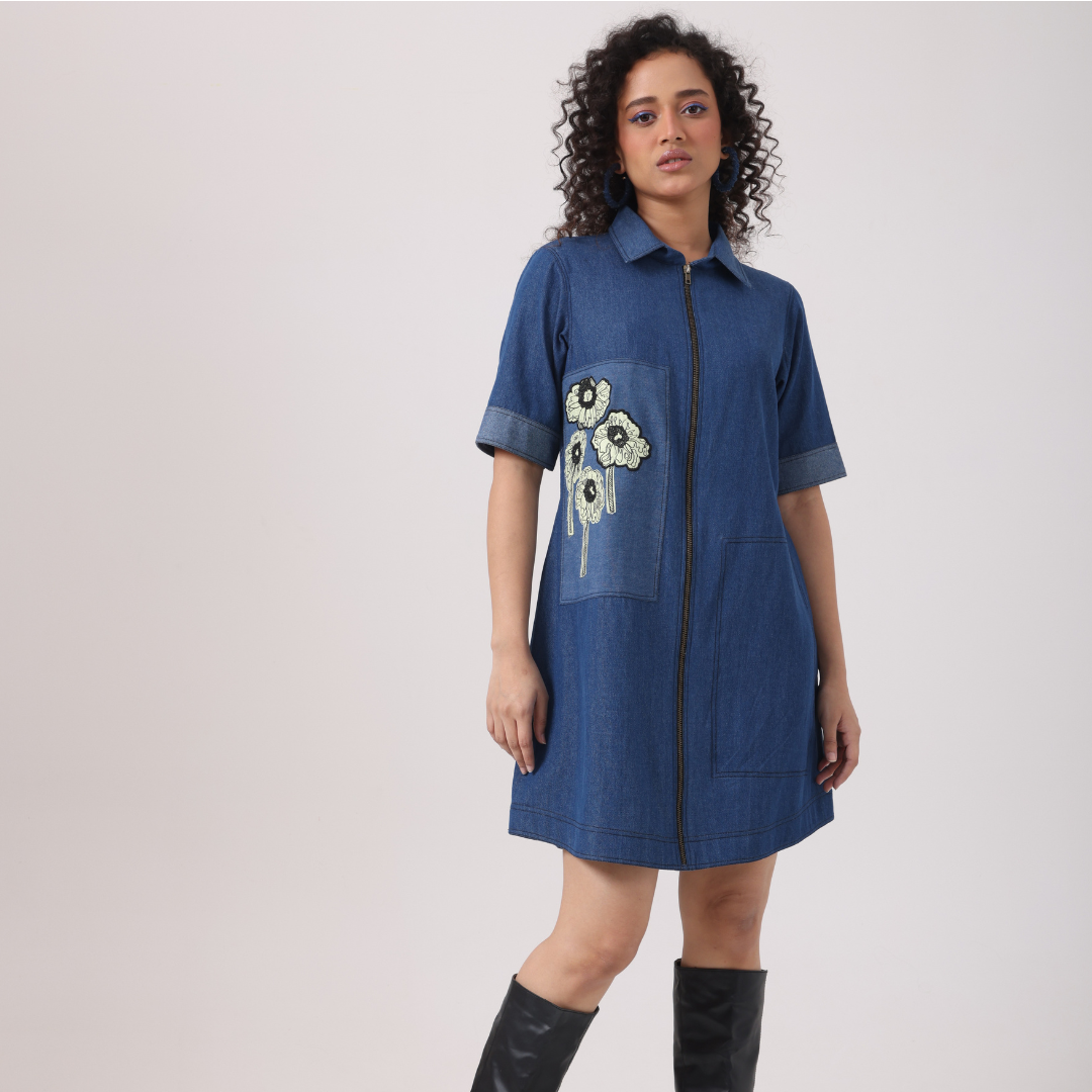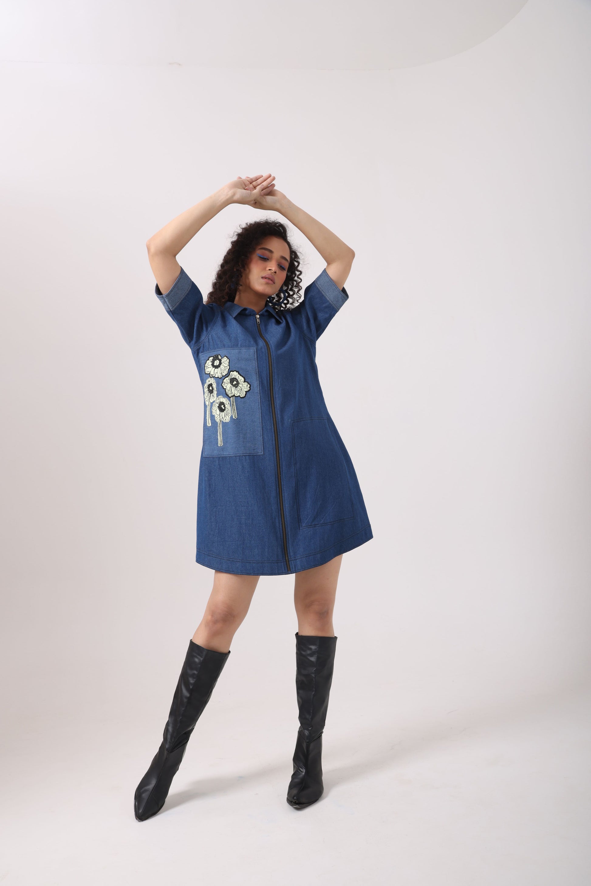 A denim mini dress with zip closure that blends bold structure with a playful twist. Featuring a vibrant lime-hued floral applique patch on one side, this piece adds just the right pop of color to your wardrobe.