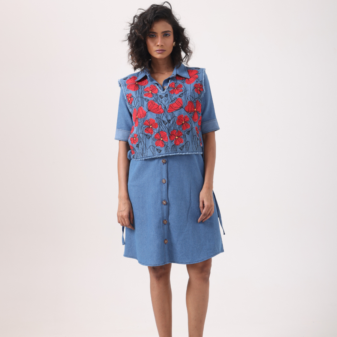 A classic denim shirt dress elevated with a statement bib embroidered in intricate red poppy flower motifs. This knee-length piece blends feminine elegance with everyday structure, making it a timeless addition to your wardrobe.
