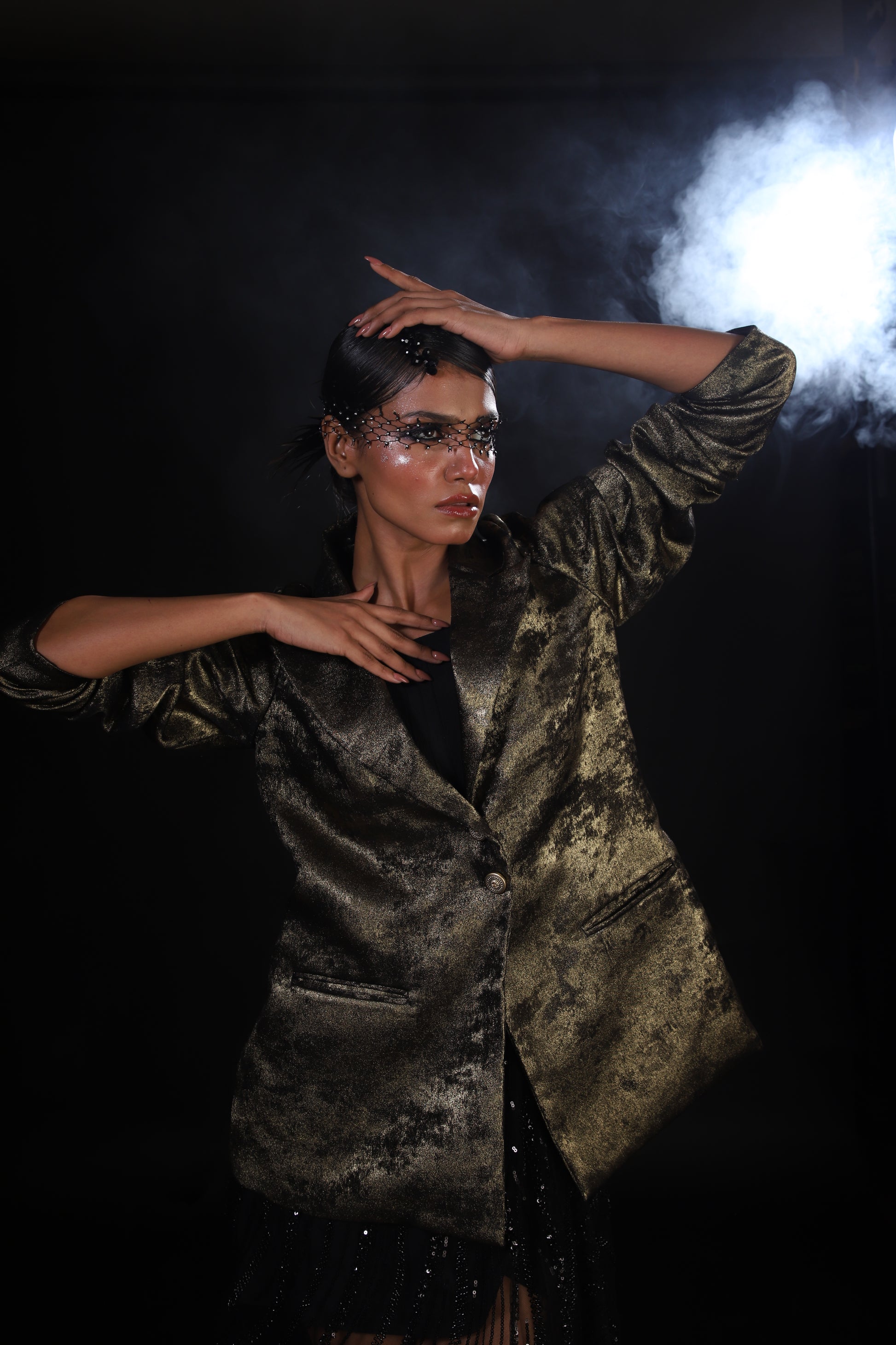 A full sleeve gold textured blazer, exuding timeless sophistication and luxe appeal in every detail.