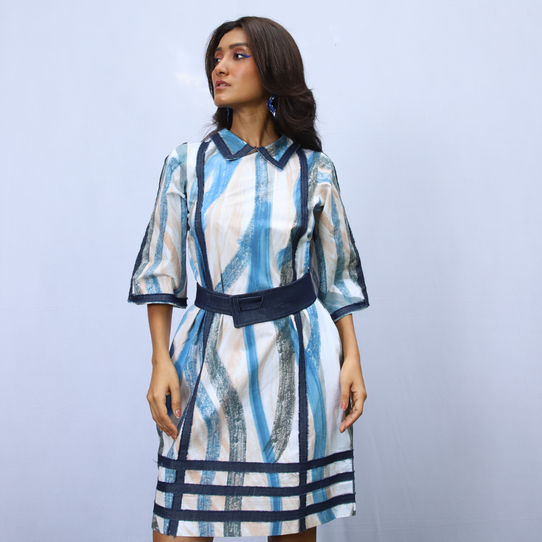 A mini dress in captivating blue brush strokes print, accentuated by denim strip details and a unique denim belt for a modern twist on classic elegance.