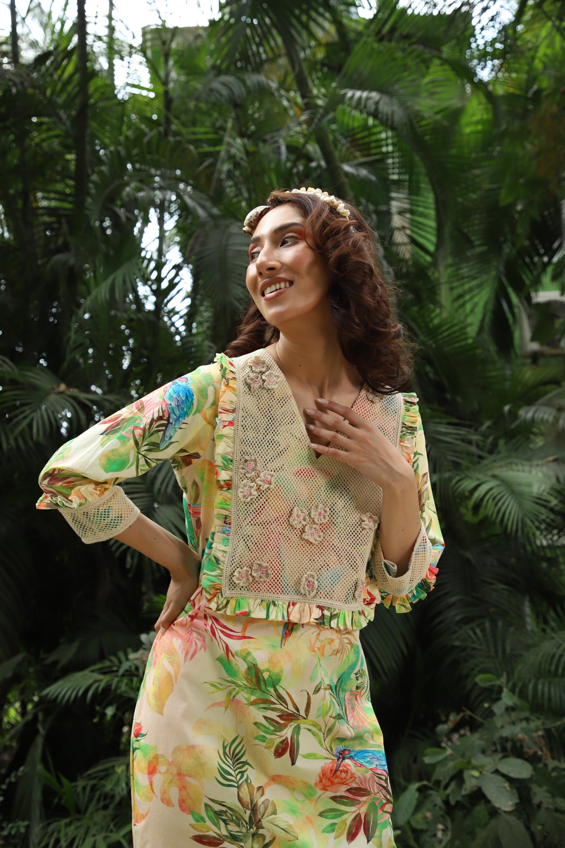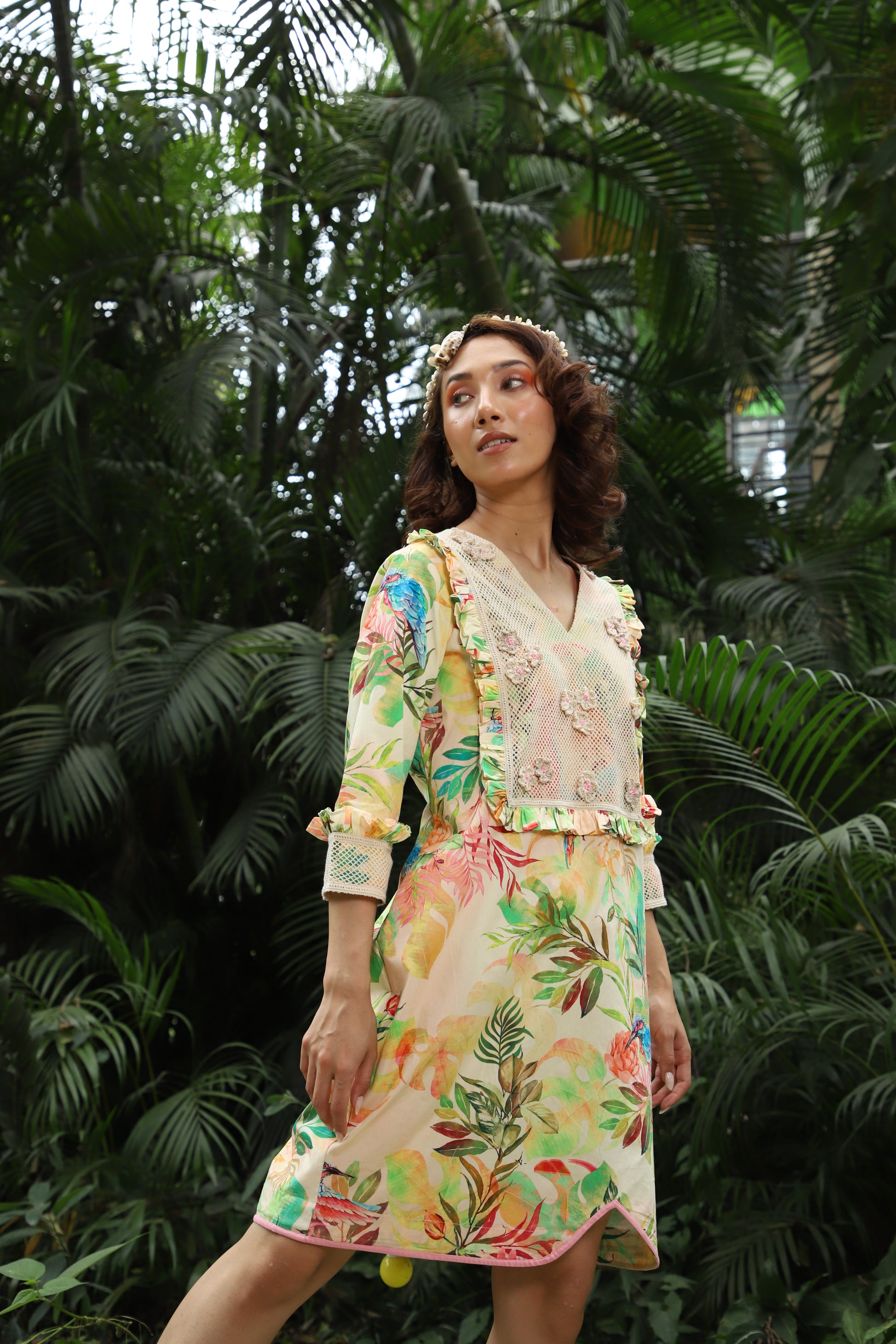 A tropical mini dress featuring a crochet bib yoke bordered with playful ruffles and adorned with intricate crochet flower details for a whimsical summer look.