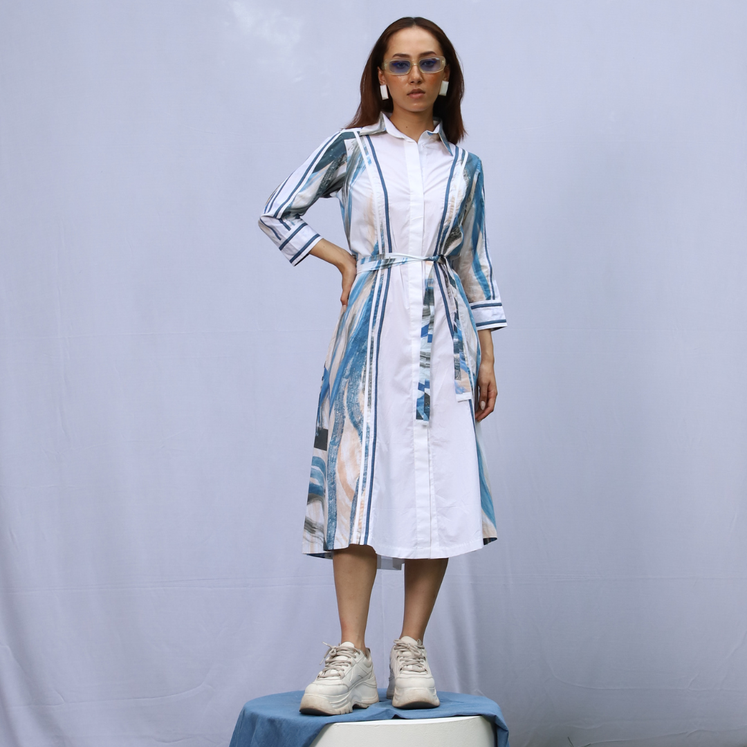 A centerpanel midi dress, showcasing captivating blue brush strokes print with panel prints and a versatile additional belt for a chic and customizable look.