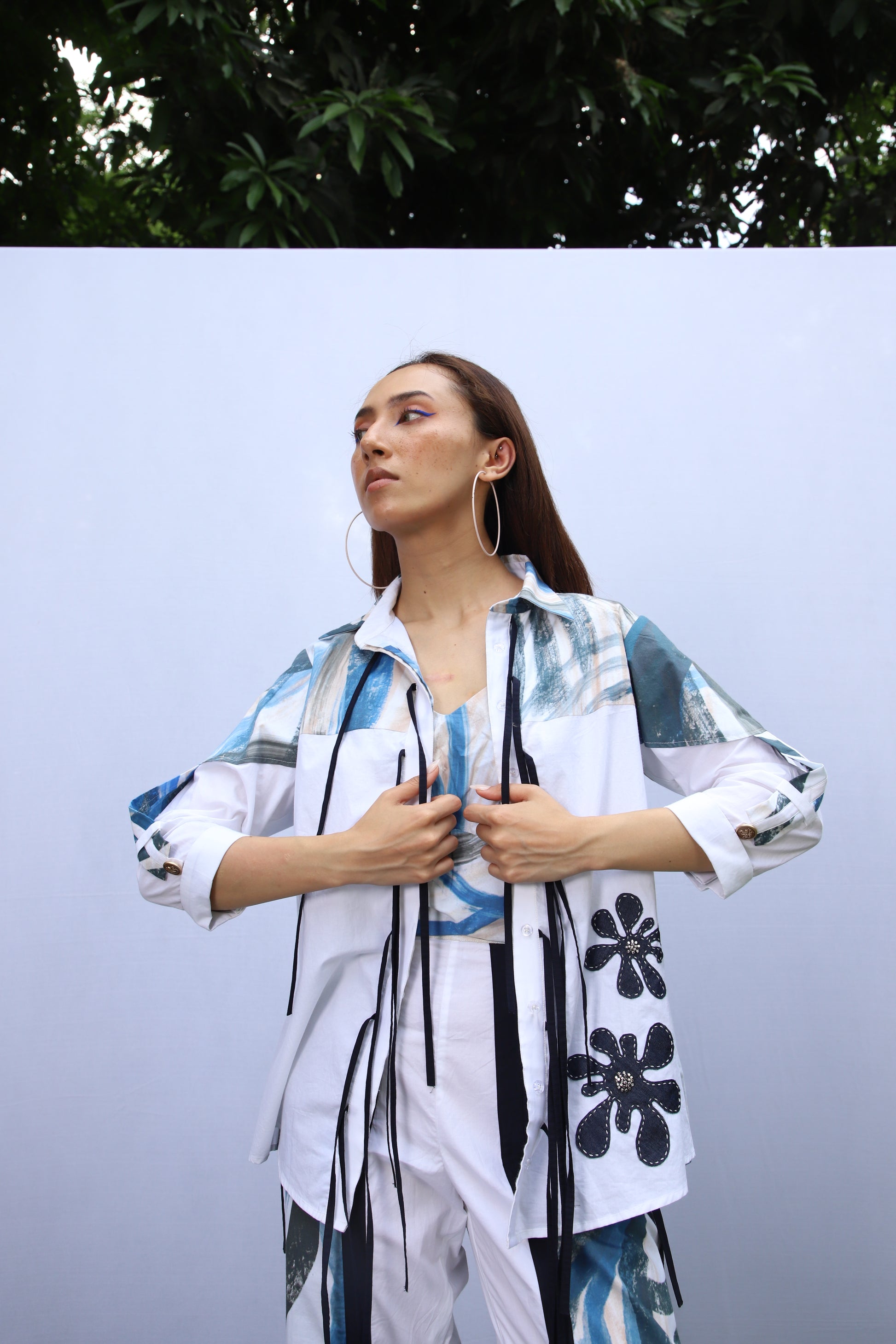 The blue brush strokes print shirt features elegant tie-up details, intricate sleeve accents, and delicate flower embroidery for a touch of whimsical charm.
