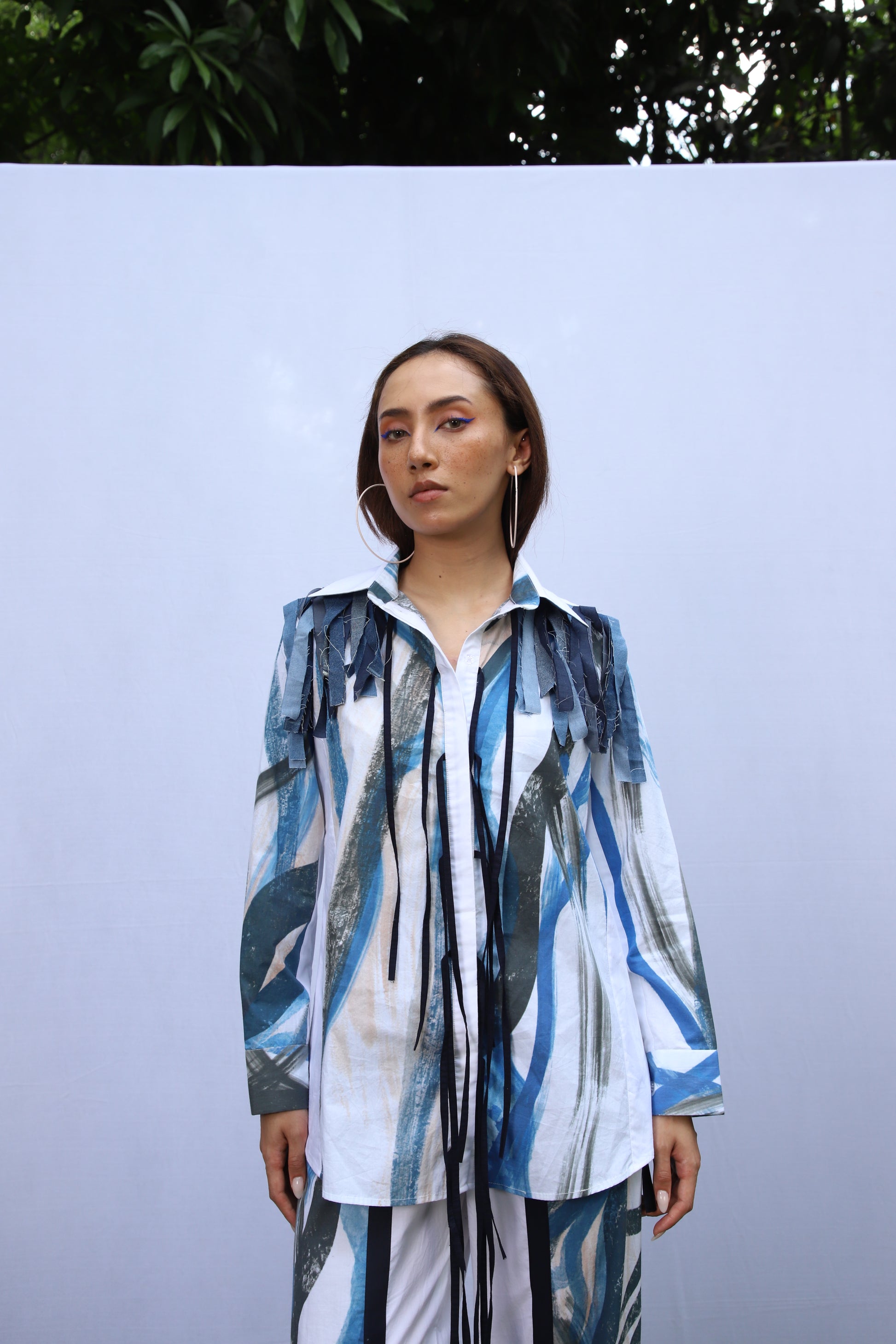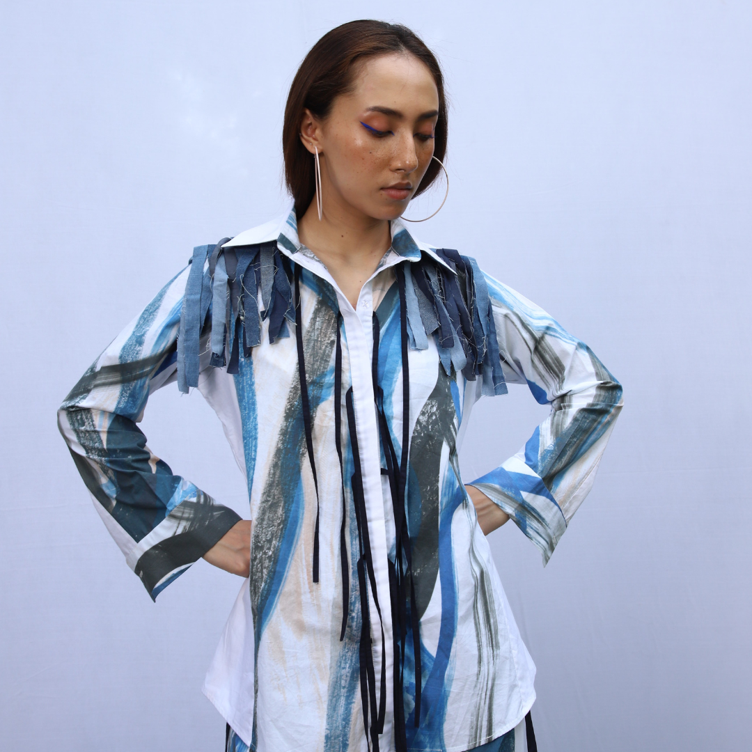A blue brush strokes print shirt, adorned with exquisite leera shoulder details and a stylish tie-up front that exudes elegance.