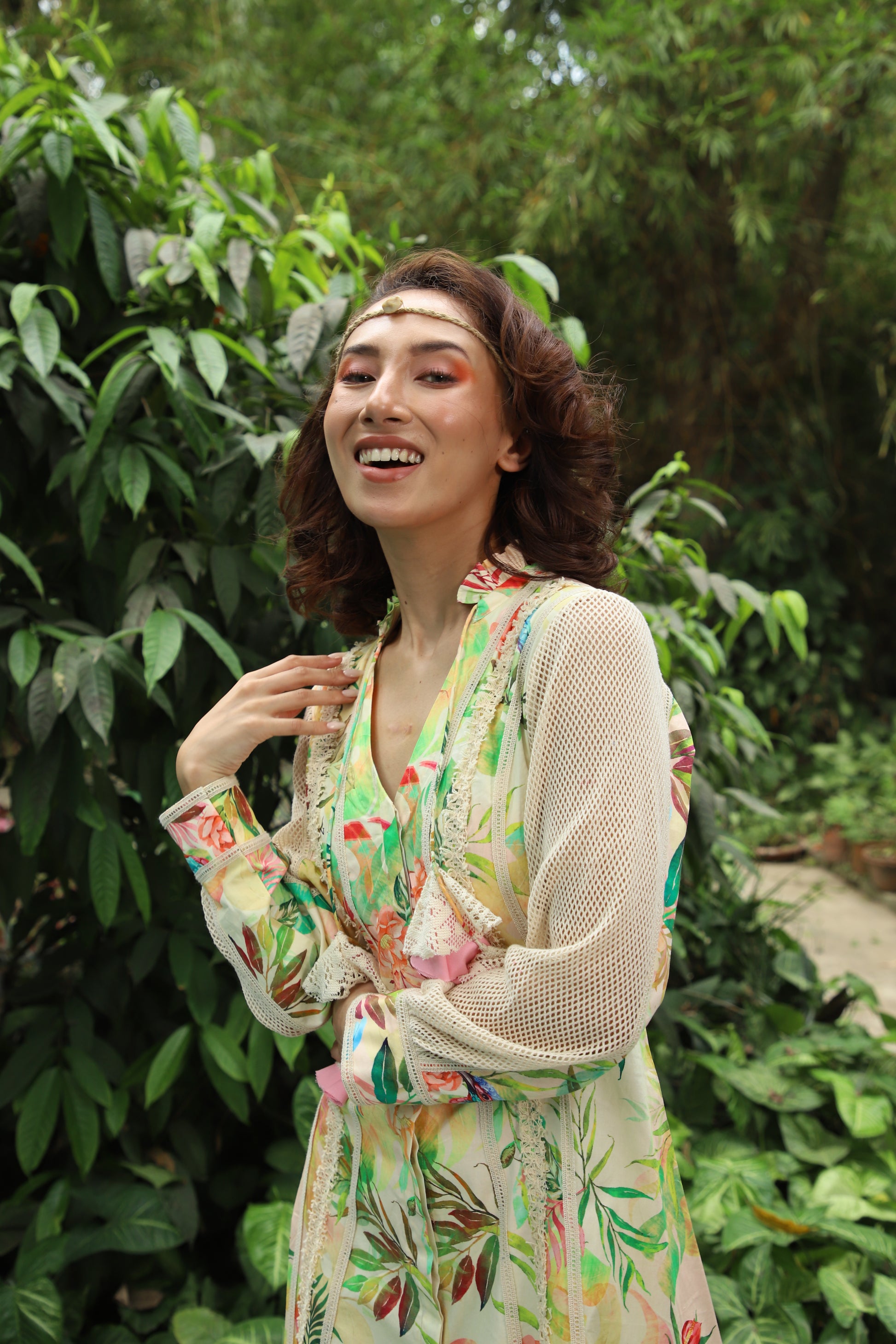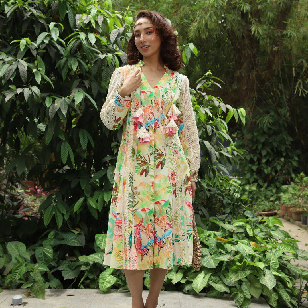 A tropical midi dress featuring delicate lace details, crochet sleeves, and intricate umbrella-shaped crochet accents on the neck with pops of pink hues.