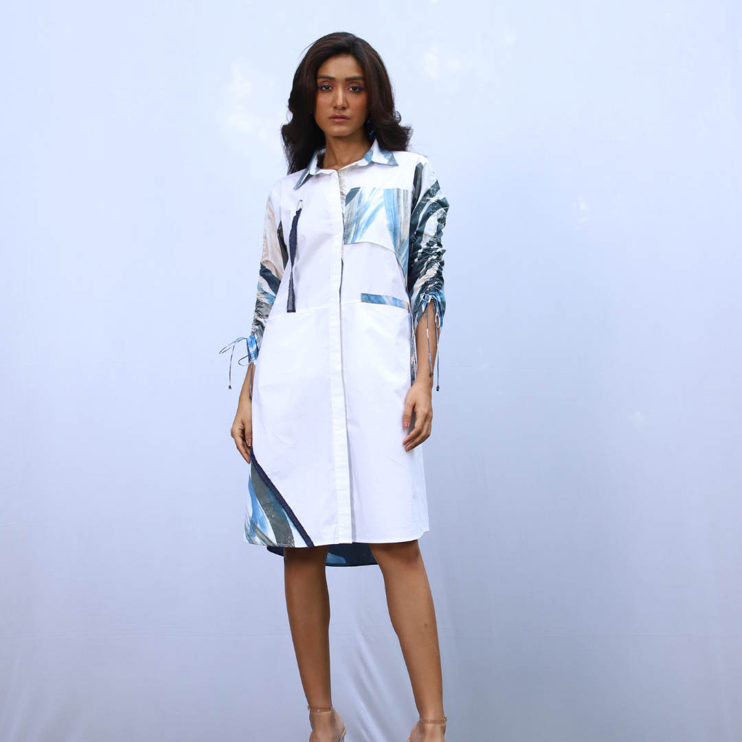 A midi dress in brush strokes print, featuring chic pocket flaps, denim strip details, and ruched sleeves for a modern yet timeless ensemble.