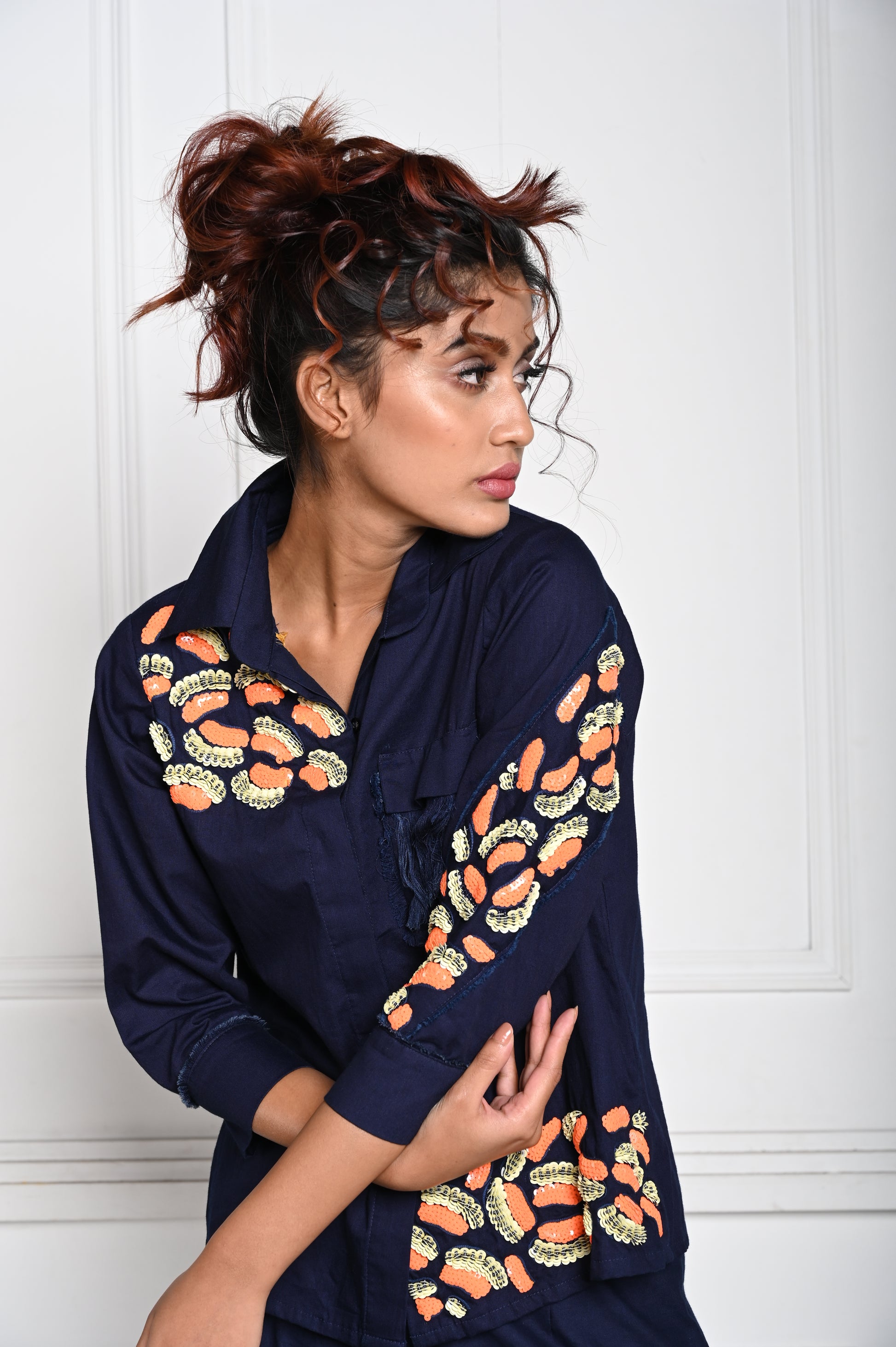 A navy poplin co-ord set with sequinned motifs in off-white and orange, with matching flared slit pants, having side zip closure with hooks and elasticated at back.