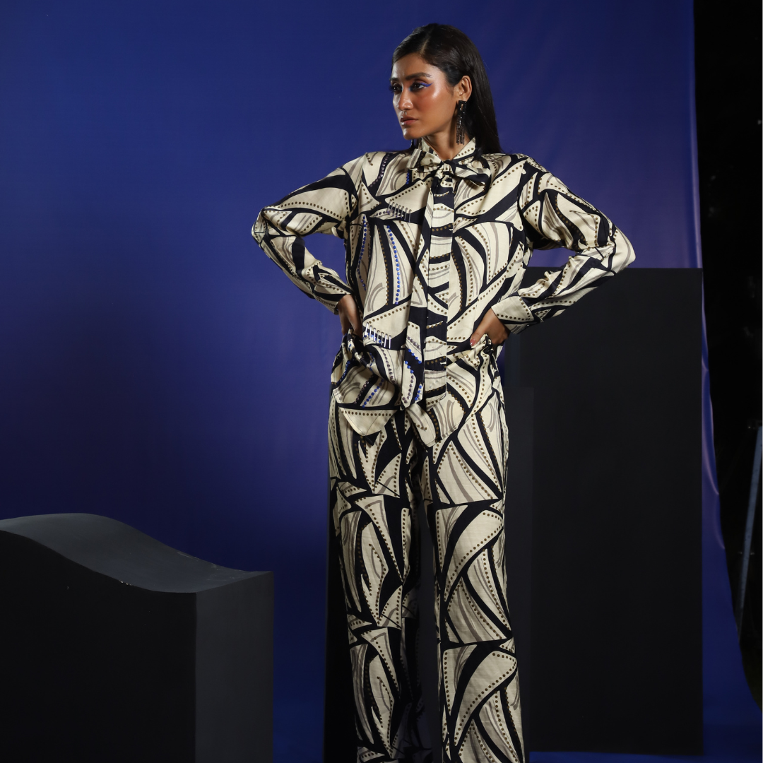 A formal co-ord set, showcasing a refined chess print, elegant neck-tie details, and exquisite sequin embellishments for a timeless ensemble.