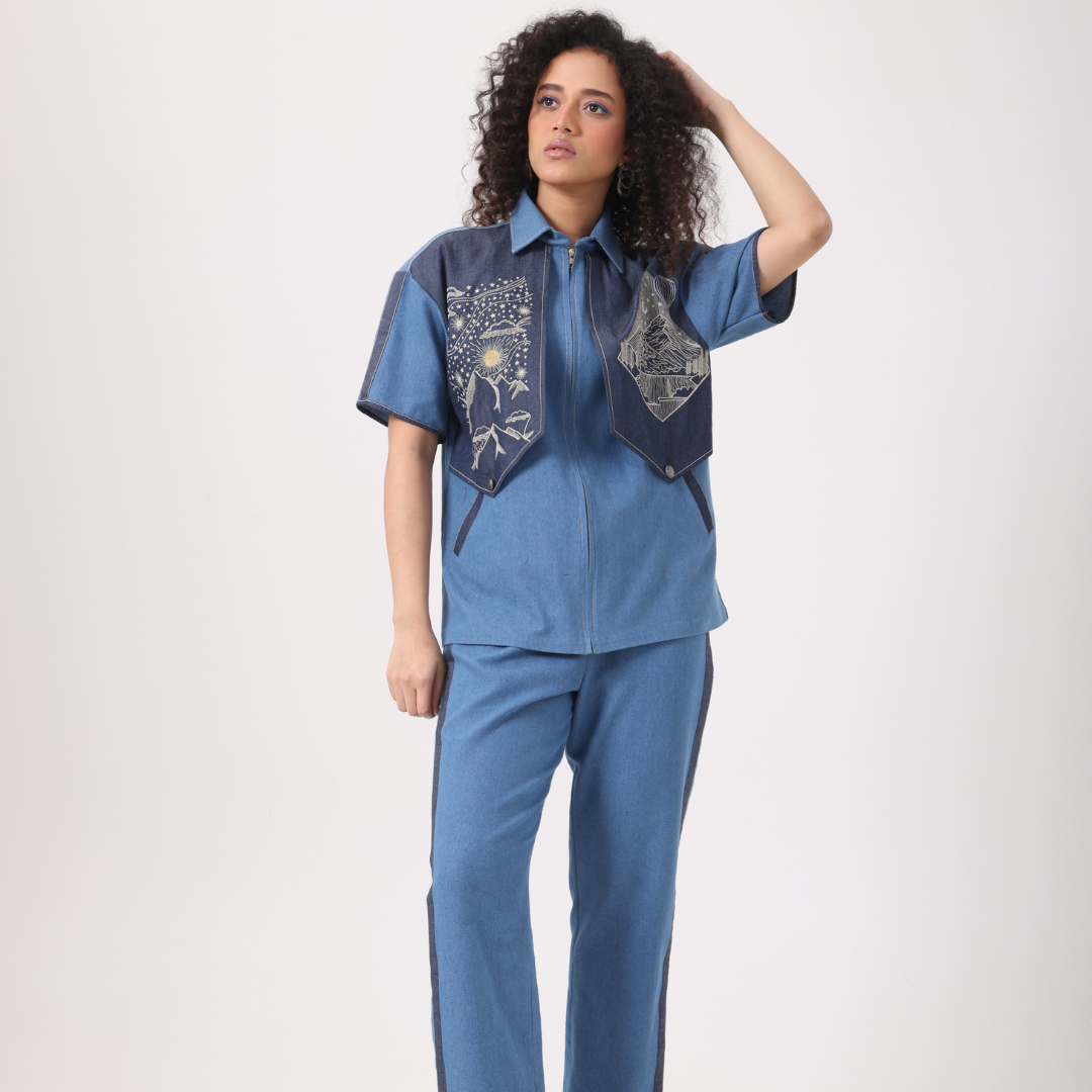 A sleek co-ord set designed with contrast denim in two distinct shades. The shirt features a striking dark denim panel adorned with intricate mountain embroidery, adding texture and storytelling to the look. Paired with matching denim pants, this set is a modern fusion of structure and statement.