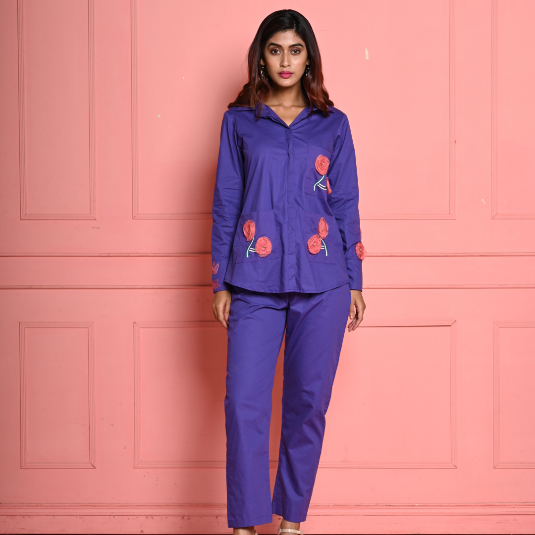 A purple poplin co-ord set featuring a chic shirt embellished with 3D organza flowers, perfectly paired with straight pants, complete with an elasticated back, side zip, and hook closure for a flawless fit.