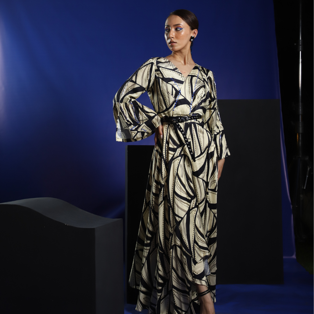 A black and white chess print maxi dress, featuring a daring high slit and glamorous sequin embellishments for an eye-catching ensemble.