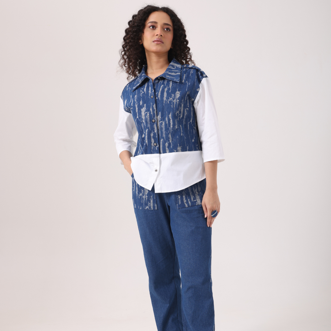 A rugged yet refined co-ord set that blends structure with edge. The white poplin shirt is elevated with a raw, distressed denim yoke, while the matching denim pants feature rugged denim patch pockets - bringing texture and character to the look.