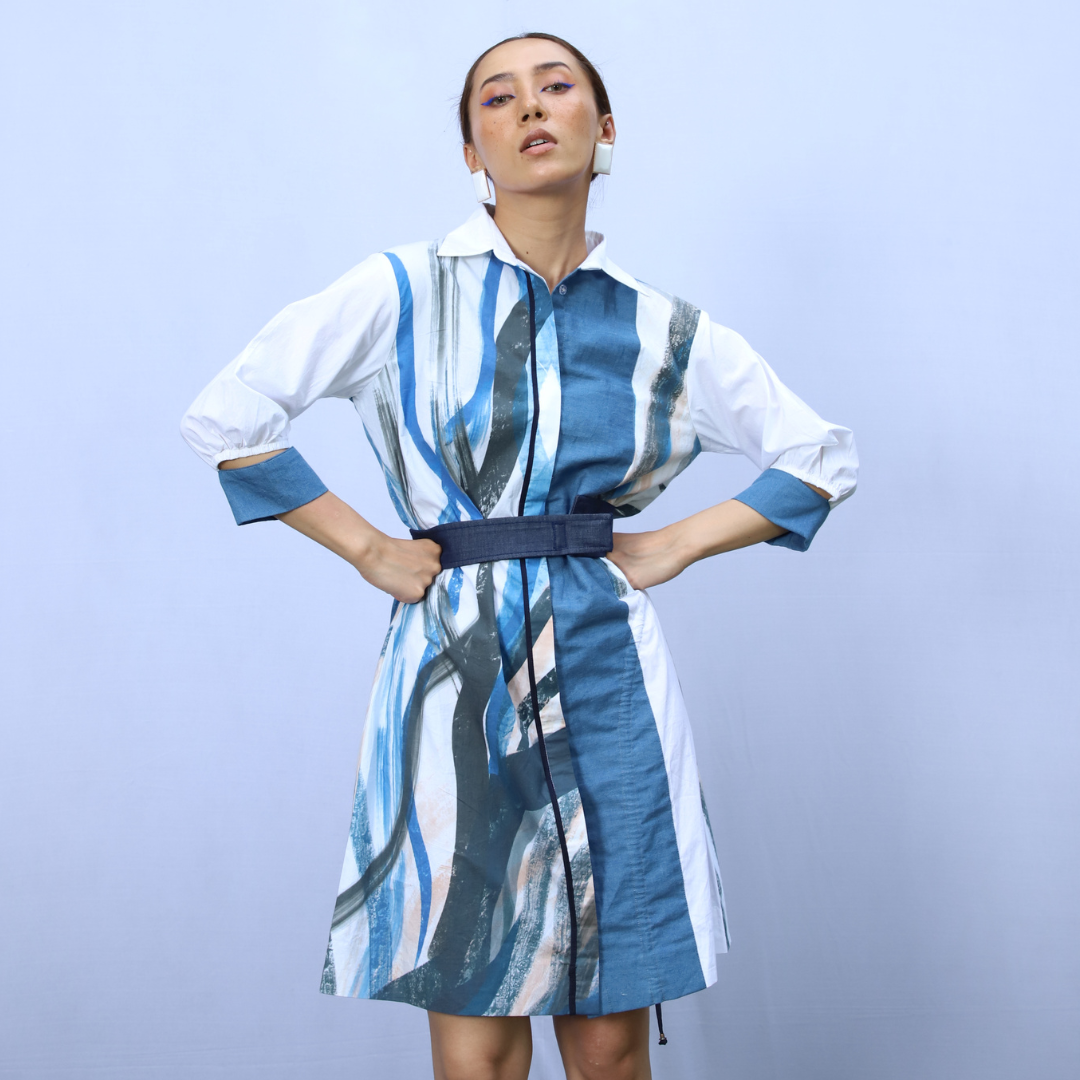 A mini dress adorned in brush strokes print, highlighted by unique sleeve details and complemented by an additional denim belt for added flair.