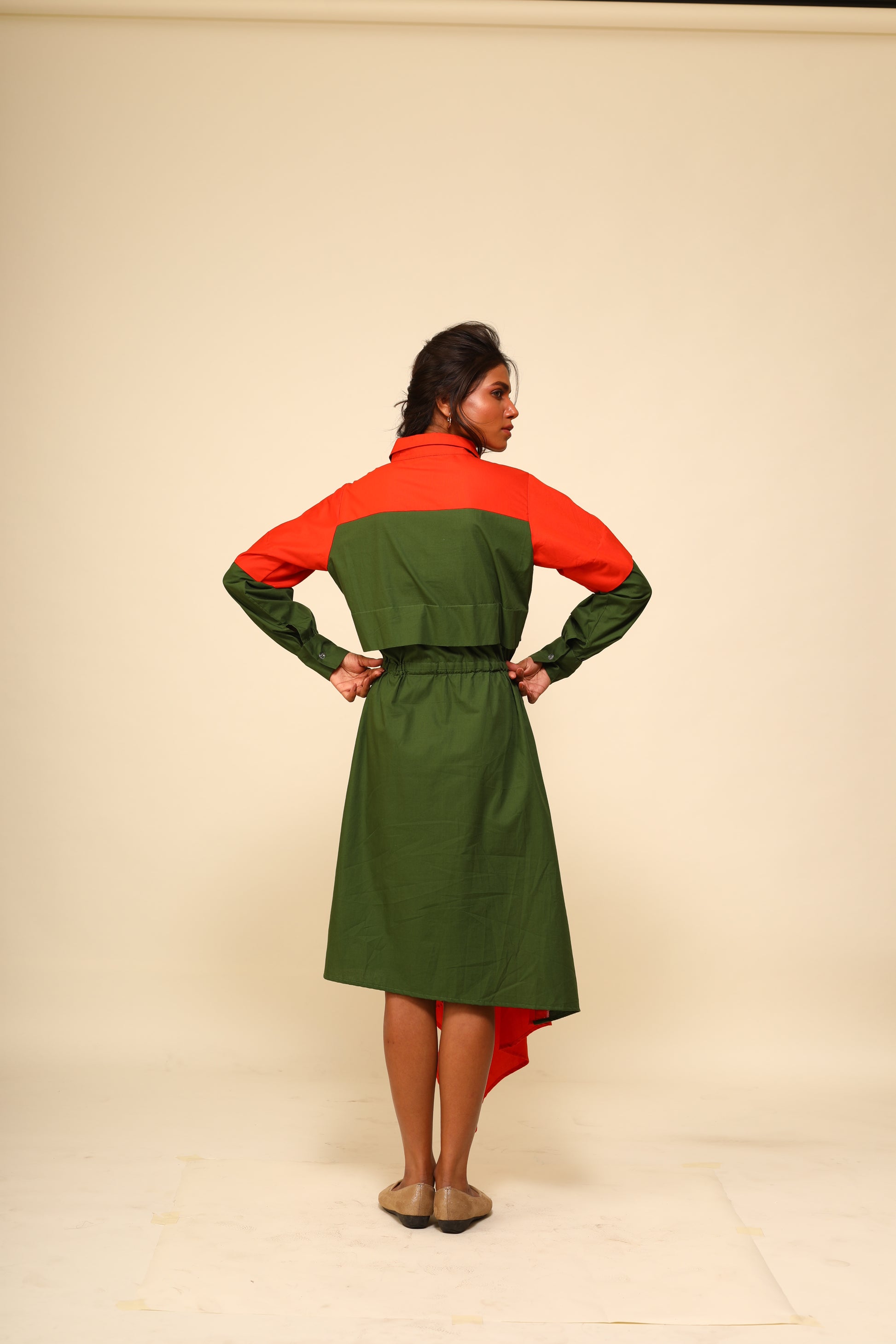 An orange and green asymmetrical dress, beautifully adorned with a unique copper coin border on the sleeves, adding a touch of elegance and artistic flair to this vibrant and stylish ensemble.