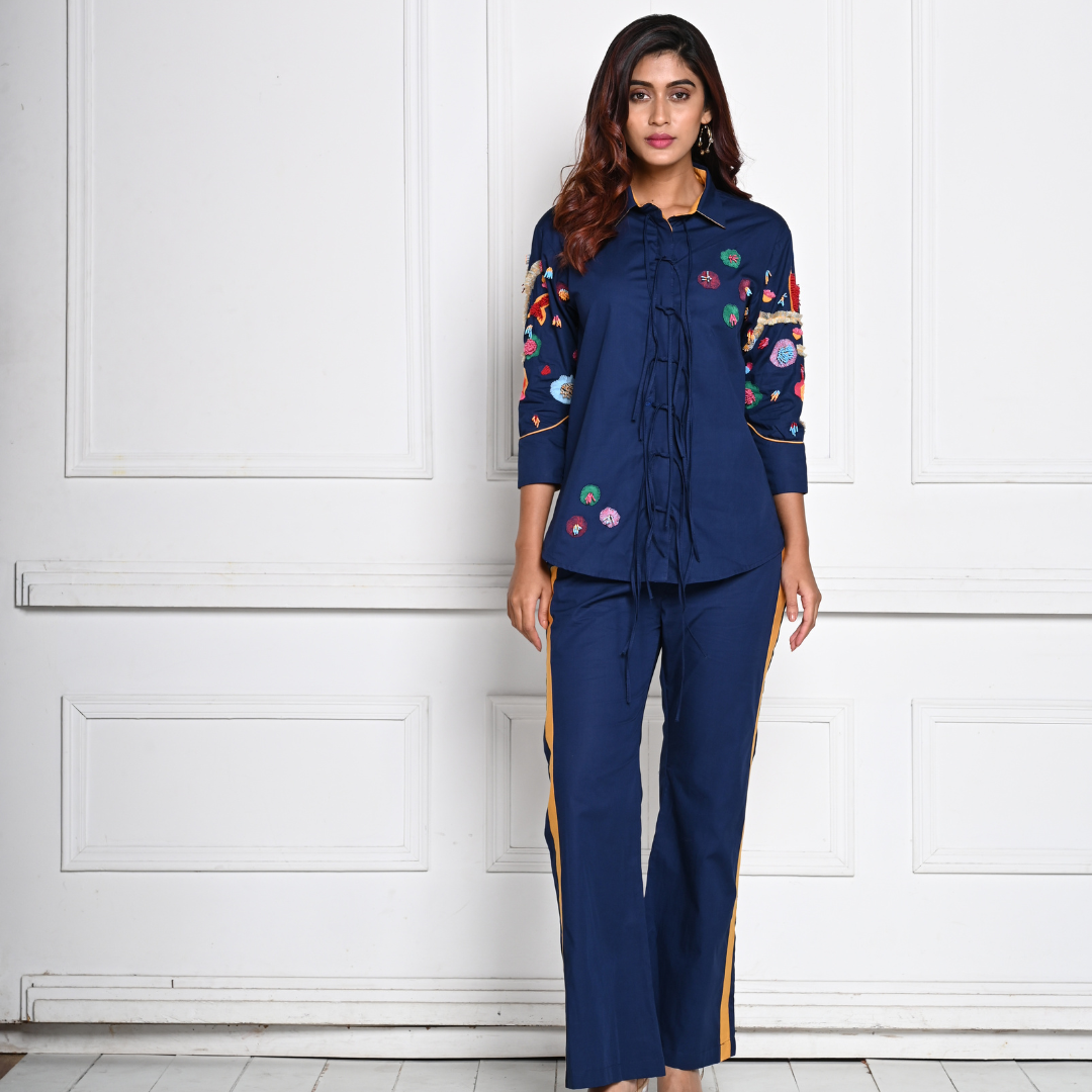 A navy poplin co-ord set, featuring intricate thread and bead coral reef embroidery on the sleeves, paired with straight pants that offer an elasticated back, side zip, and hook closure for a perfect blend of comfort and elegance.