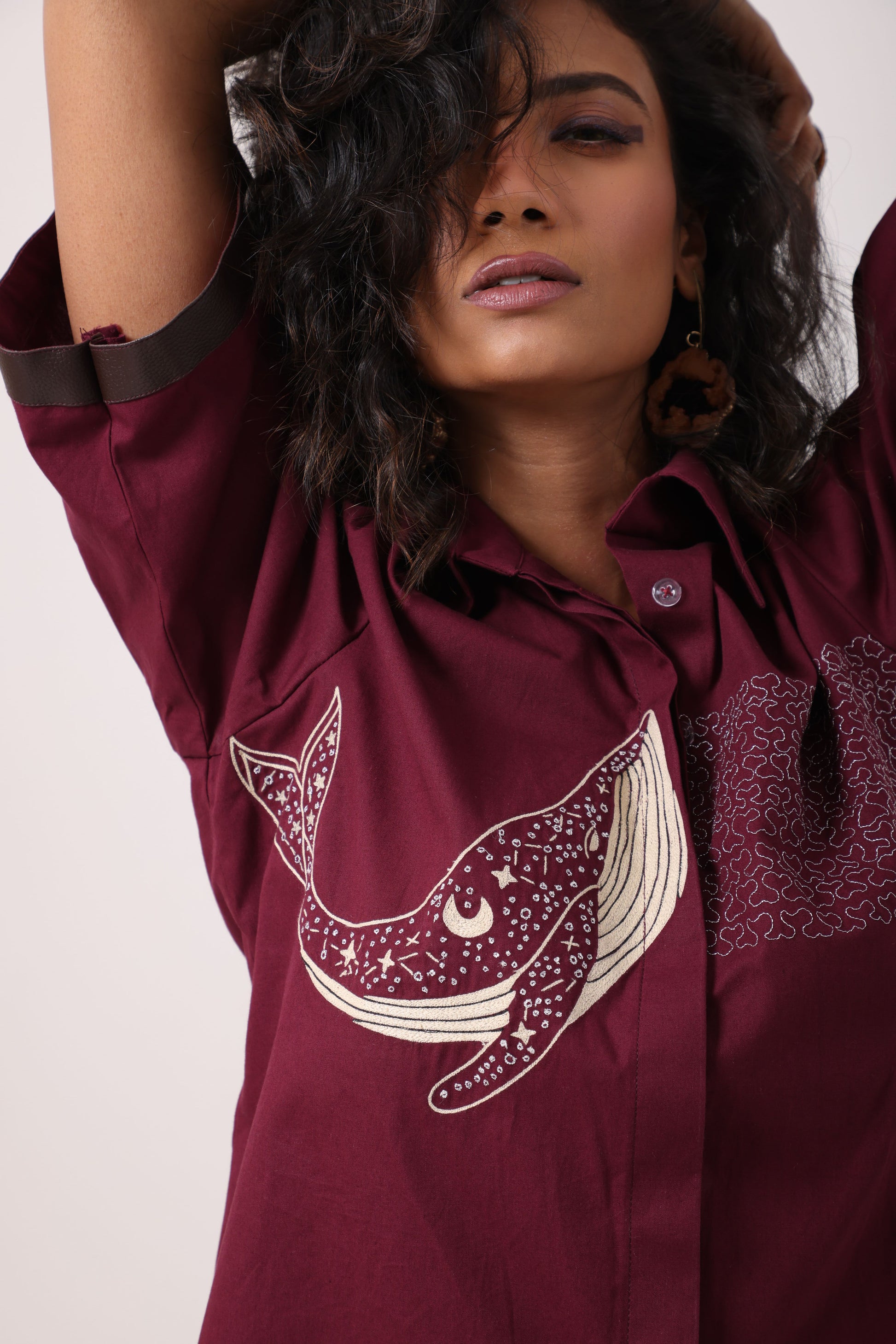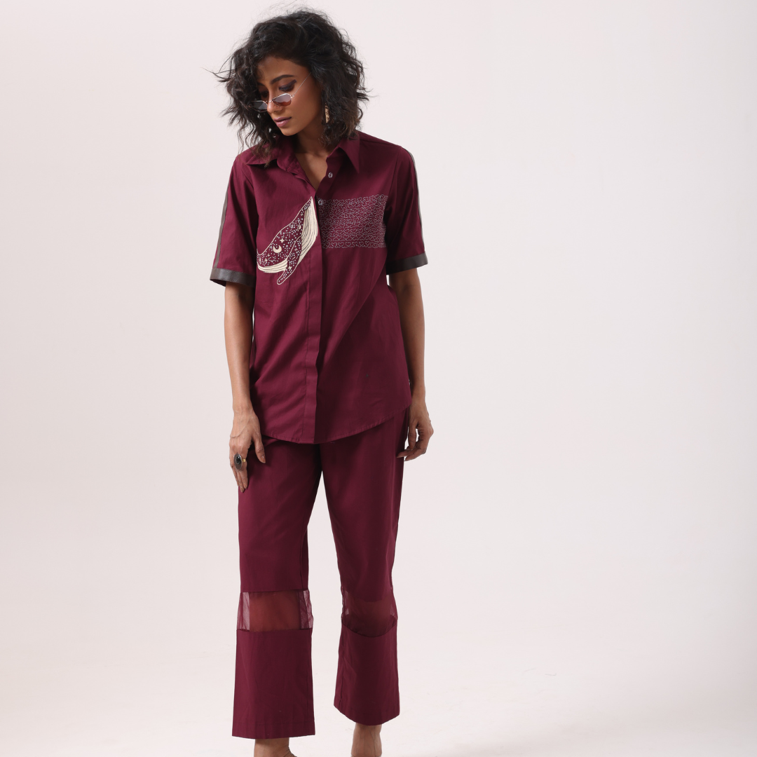 A coordinated set in rich wine that features a relaxed-fit shirt adorned with intricate whale embroidery and leather details, paired with straight-fit pants elevated by sheer organza paneling towards the hem.